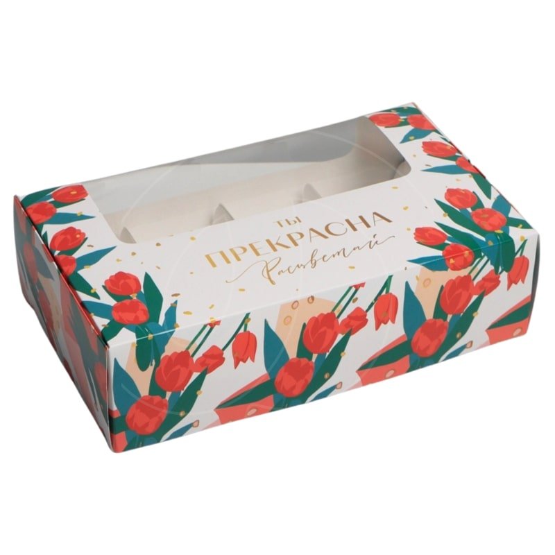 Доставка Коробка на 4 эклера с окном "Тюльпаны" 25,2х15х7 см из магазина в вашем городе: