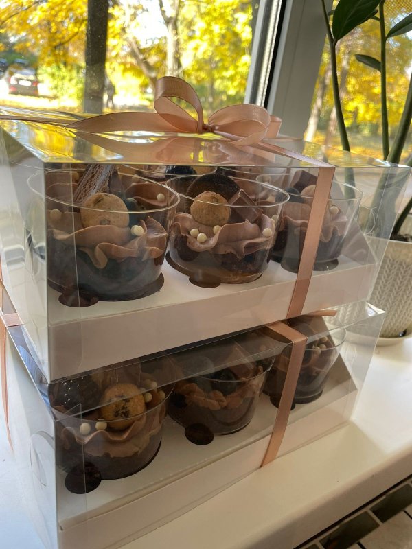 очень красивая коробочка!!!! С ленточкой смотрится дорого) Прозрачная крышка позволяет видеть десерт практически со всех сторон.