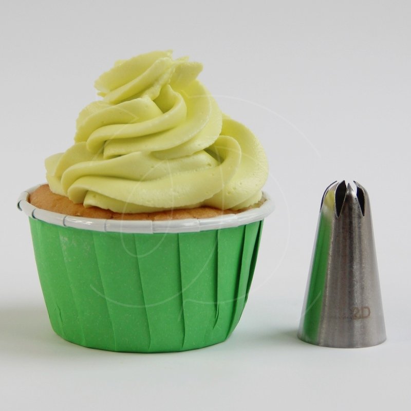 Одна из моих самых любимых насадок для декора. Делаю с помощью неё шапочки на капкейки, небольшие розочки-завитушки на торт, украшаю эклеры и т.п. Очень нравится, что у неё всего 6 лучей и рисунок получается красивый, не слишком частые «рёбра» получаются на готовых шапочках. Металл хороший, плотный, насадка очень качественная и будет служить вам долго.
