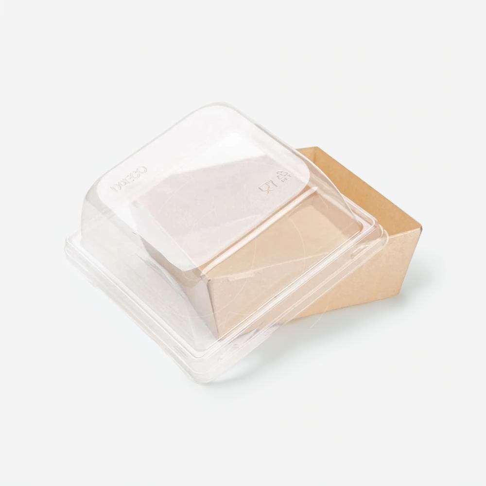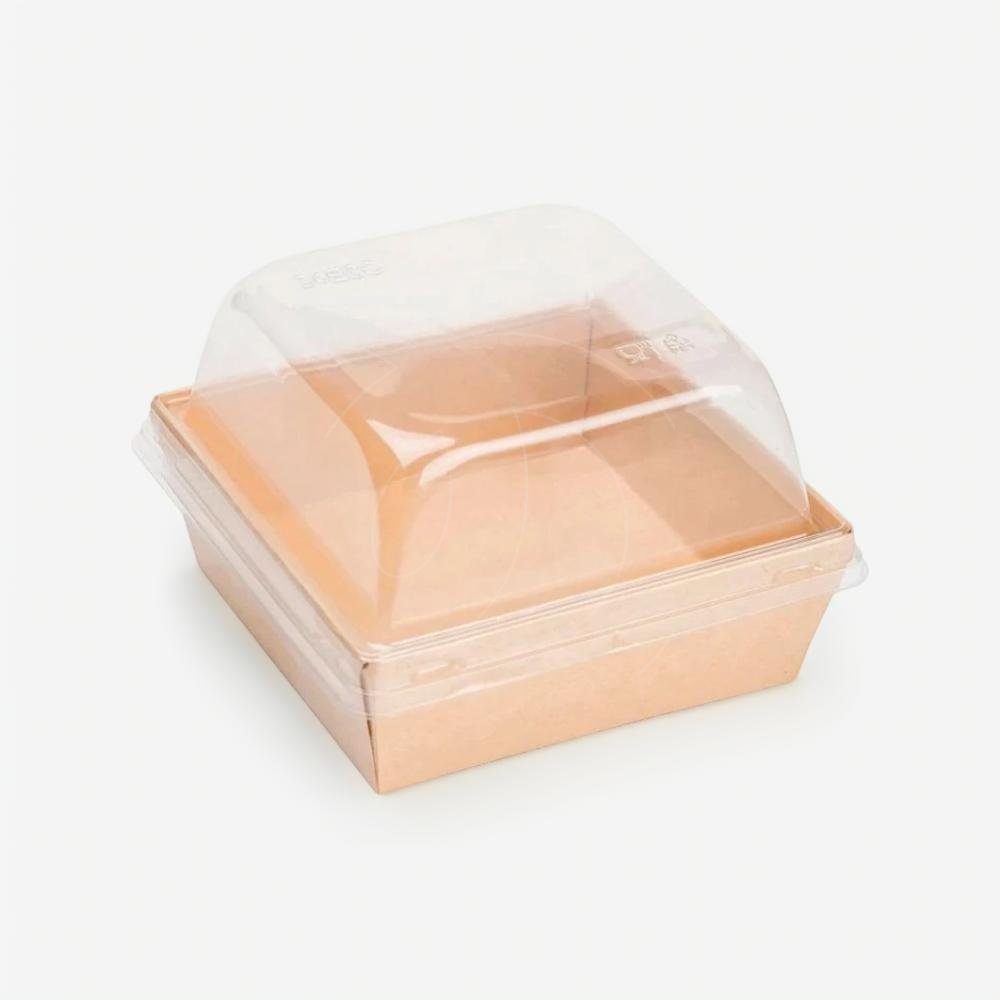 Упаковка выполнена из пищевого картона с жёсткими двойными бортами, дном и пластиковой крышкой.